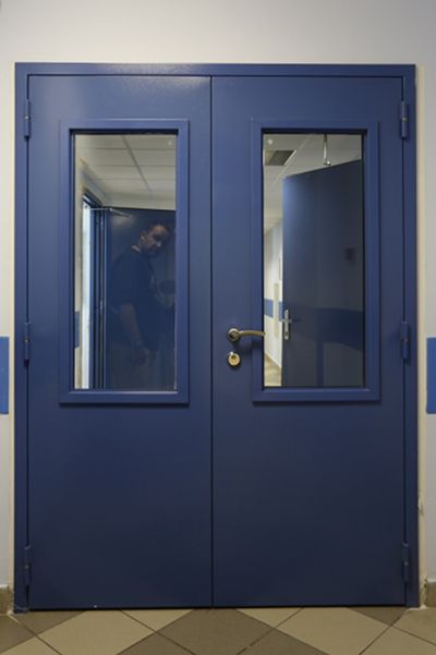 Противопожарная алюминиевая дверь синего цвета в Ногинске